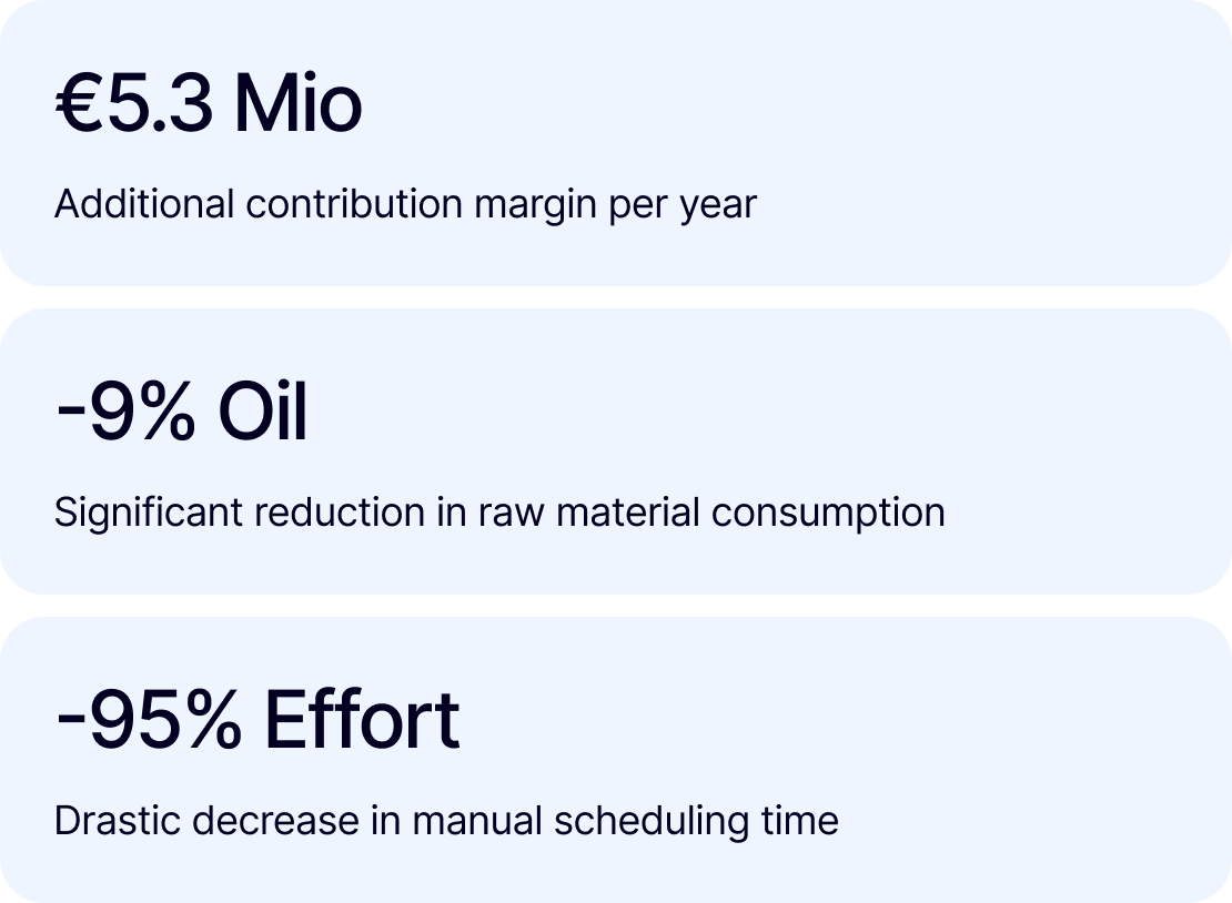 The result: over €100,000 in additional contribution margin per week, drastically reduced planning effort, and a shift of production scheduling from daily firefighting to a strategic capability.