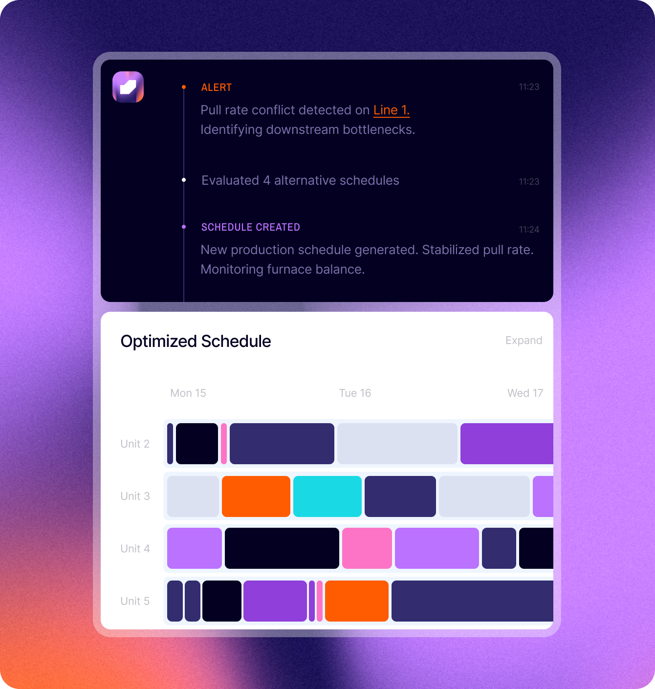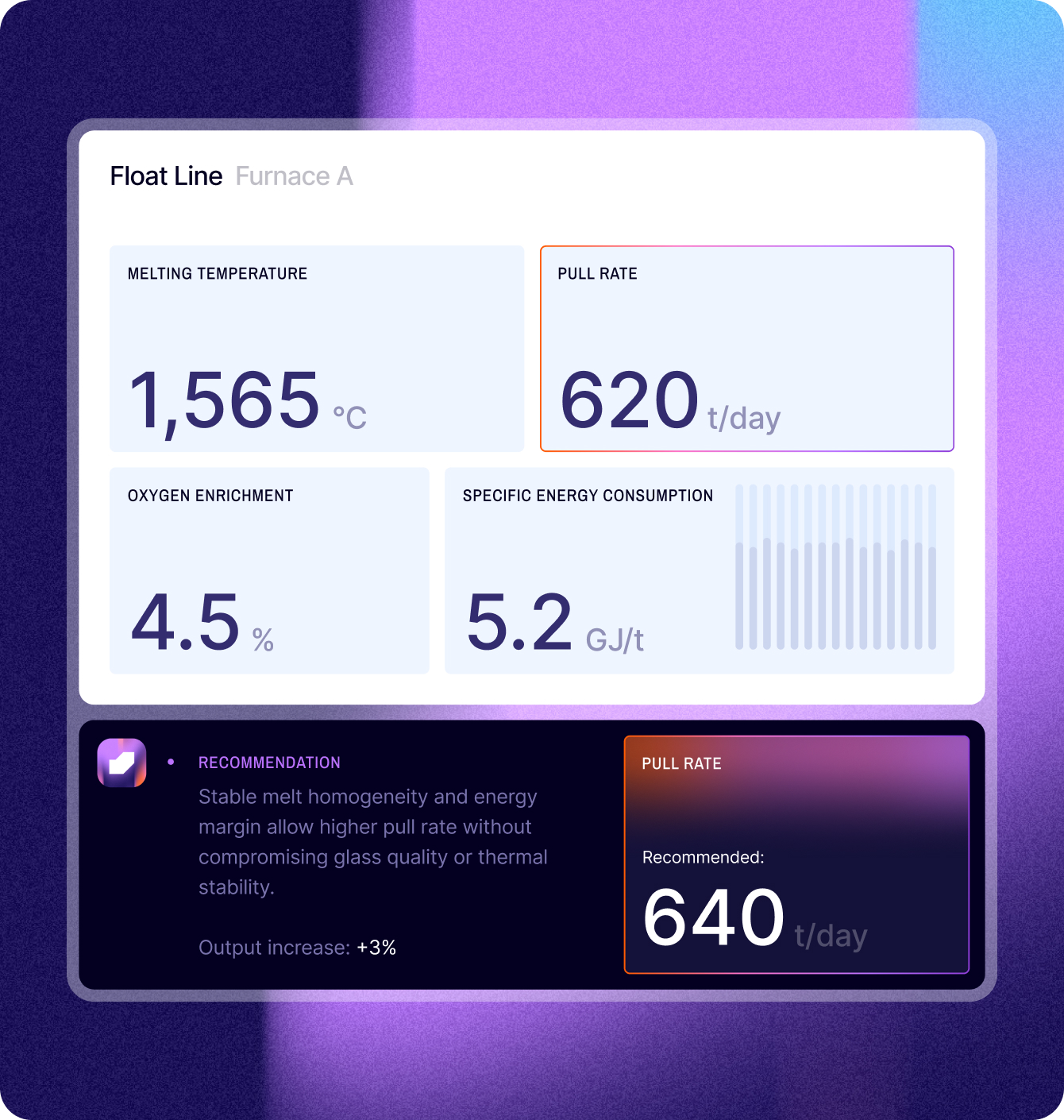 Juna helps glass manufacturers unlock the full potential of their furnaces and lines. We deploy AI agents that understand, optimize, and continuously adapt melting, forming, annealing, and cold-end operations to increase pull, reduce energy cost, and stabilize production under tight quality and emission constraints.
